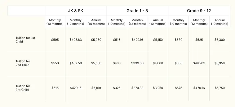 Grade 1 to Grade 8 ………………………………………… September 2025 to June 2026 ………………………………….. $5,150